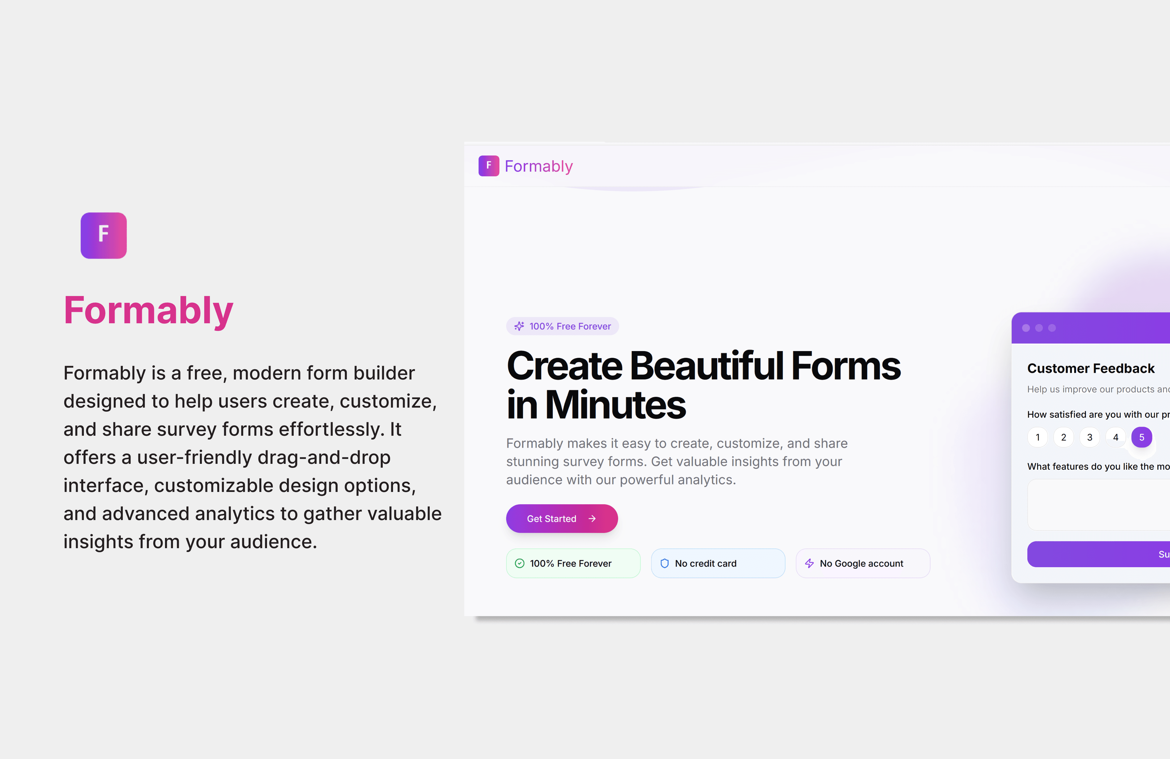 Formably is a free, easy-to-use form builder for surveys and data collection. It offers drag-and-drop design and real-time analytics.