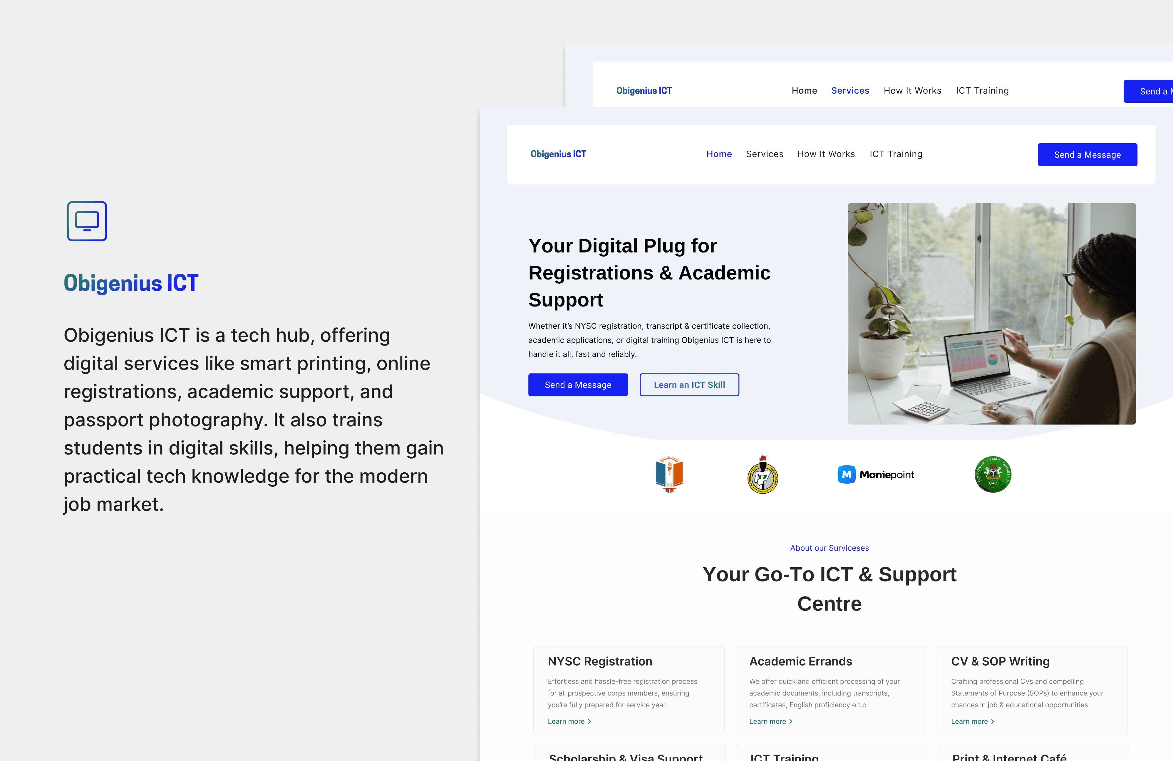 Obigenius ICT is a tech and service center, offering printing, academic support, and digital solutions. It also empowers students with hands-on training in digital and tech skills.